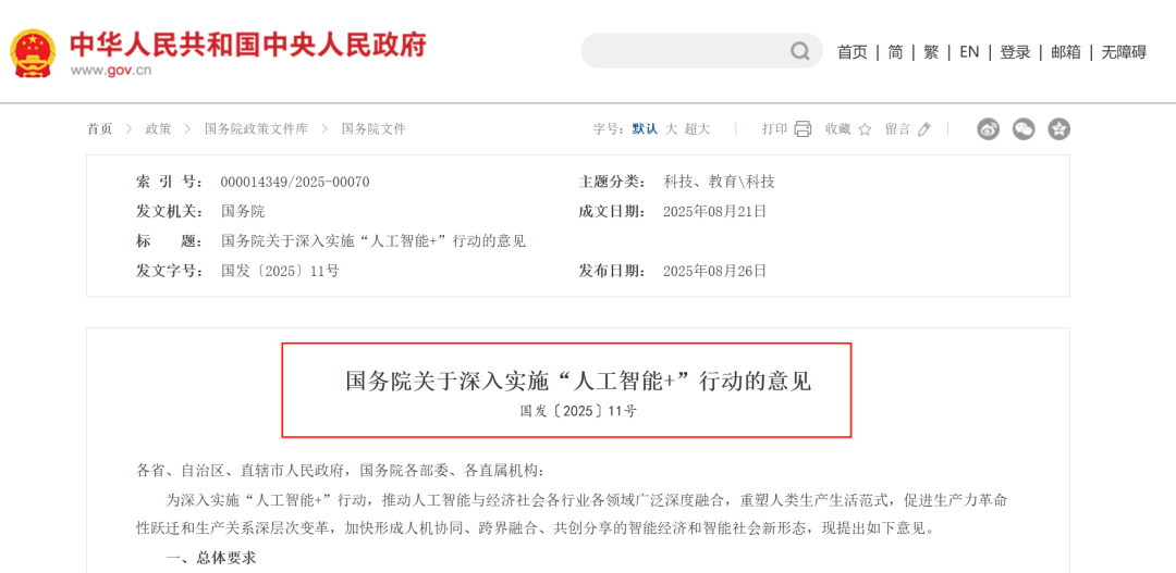 近日,《國(guó)務(wù)院關(guān)于深入實(shí)施“人工智能+”行動(dòng)的意見(jiàn)》(以下簡(jiǎn)稱《意見(jiàn)》)正式對(duì)外發(fā)布,引起極大關(guān)注。近年,不少AI相關(guān)政策或綱領(lǐng)已陸續(xù)出臺(tái),這份文件到底有什么特別的分量,和企業(yè)又有什么關(guān)系?本文將與您一同解讀本次發(fā)布。